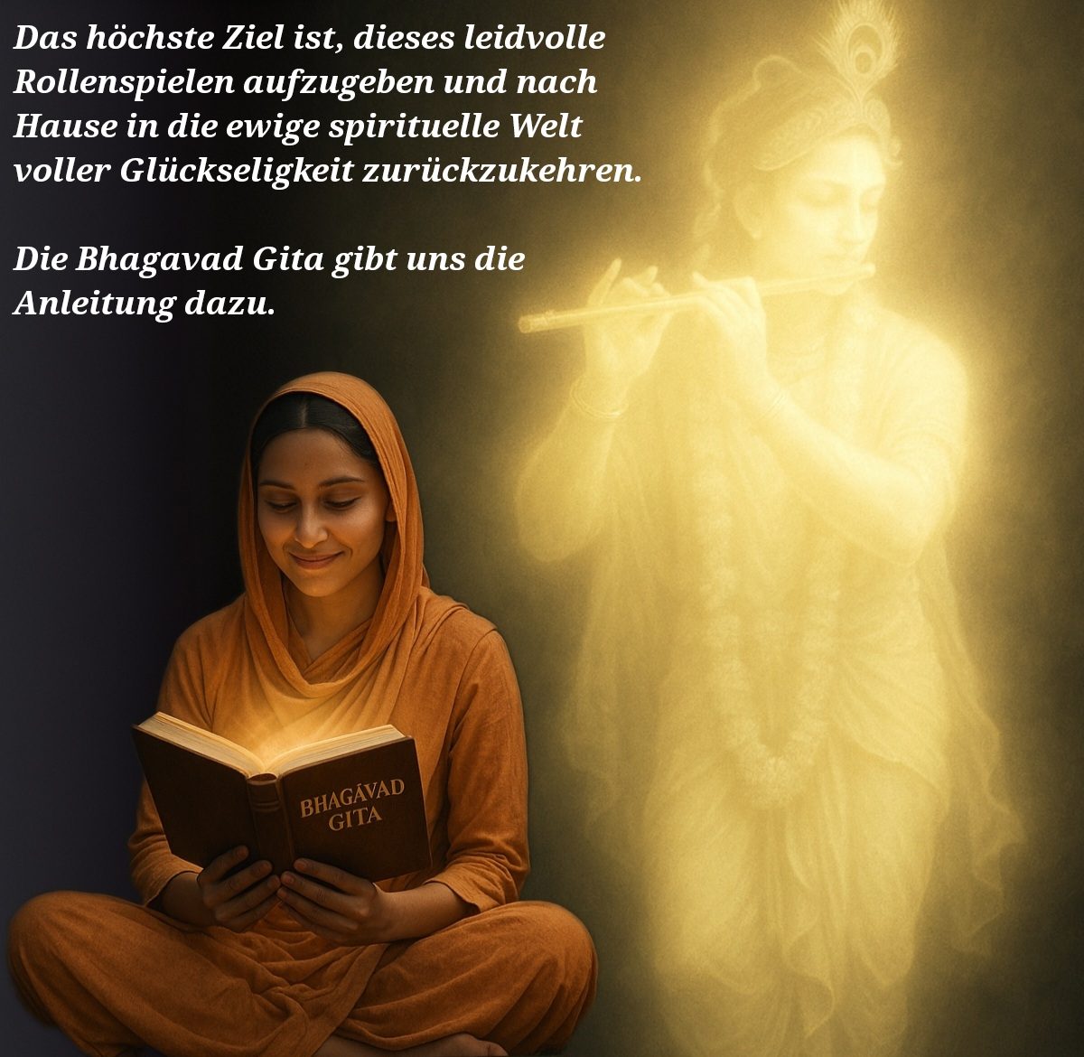 Die Illusion in der wir alle leben ist, dass wir glauben, auf uns allein gestellt vollkommenes unvergängliches Glück finden zu können, wenn wir es nur lang genug suchen. Mit Bhakti-Yoga weist Krishna, der Verkünder der Gita, uns einen Weg, wie wir wirklich vollkommenes unvergängliches Glück finden.