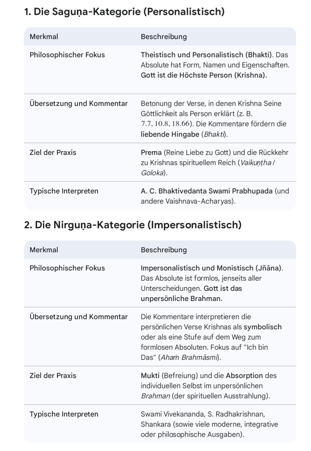 Jeder nach Selbstverwirklichung Suchende sollte, bevor er sich für eine Bhagavad Gita entscheidet, sich klar werden, welchen Weg er folgen will: gehe ich nur bis zum unpersönlichen Brahman, mit dem Ziel im Verschmelzen mit dem Brahman meine Individualität aufzugeben oder gehe ich weiter bis zur Quelle des Brahman, zum Höchsten, durch bhakti yoga, die liebende Hingabe, mit dem Ziel in der Liebe in Beziehung zum Höchsten das höchste Glück zu erreichen. Srila Prabhupada nannte das Folgen der nirguna Auslegung der Gita spirituellen Suizid. Mit AI ist es sehr leicht die Information, nirguna oder saguna, über jede Gita zu erhalten.